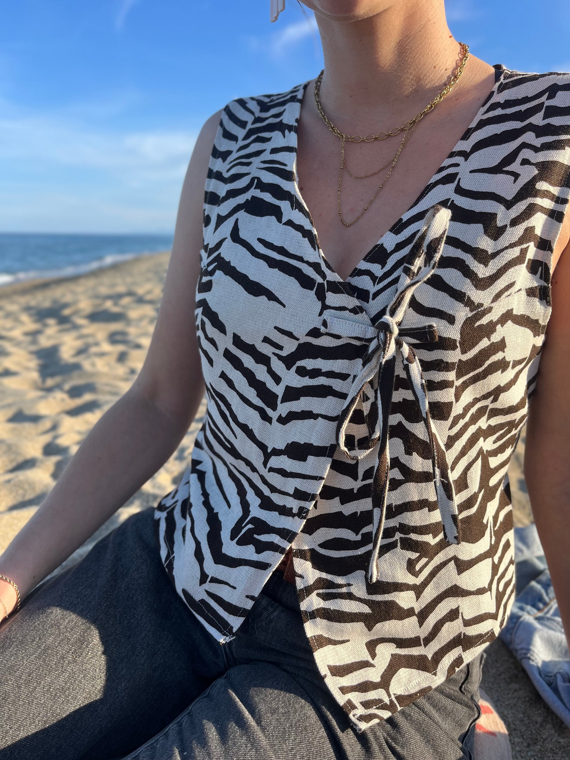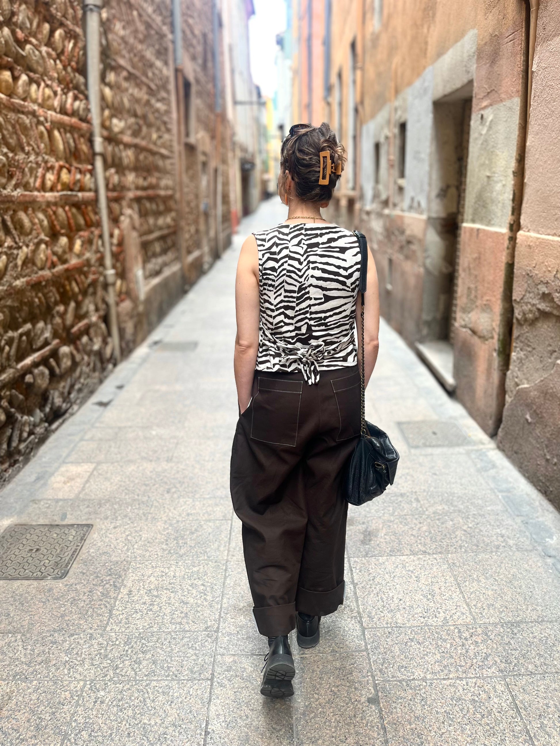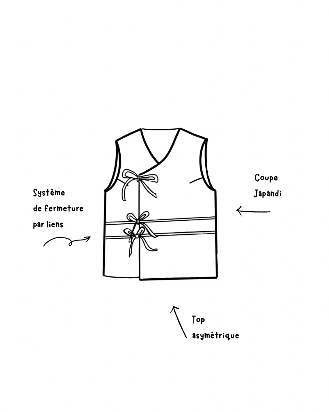 Le top Andy réinvente la veste d’été avec une coupe inspirée du style Japandy, à mi-chemin entre l’épure japonaise et la fonctionnalité scandinave. Sa structure droite et son pan asymétrique apportent une touche contemporaine, tandis que les liens à nouer permettent de le porter de multiples façons : ouvert sur un t-shirt, fermé à même la peau, ou cintré dans le dos pour souligner la taille. Une pièce versatile, pensée pour accompagner tous vos mouvements.